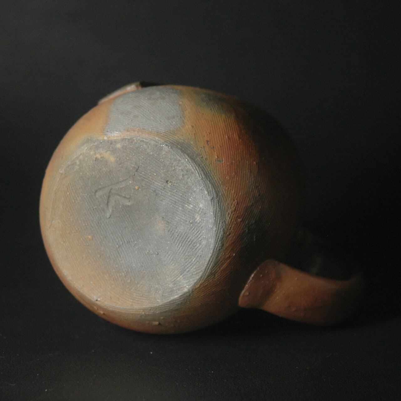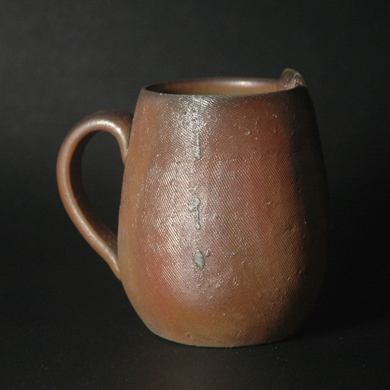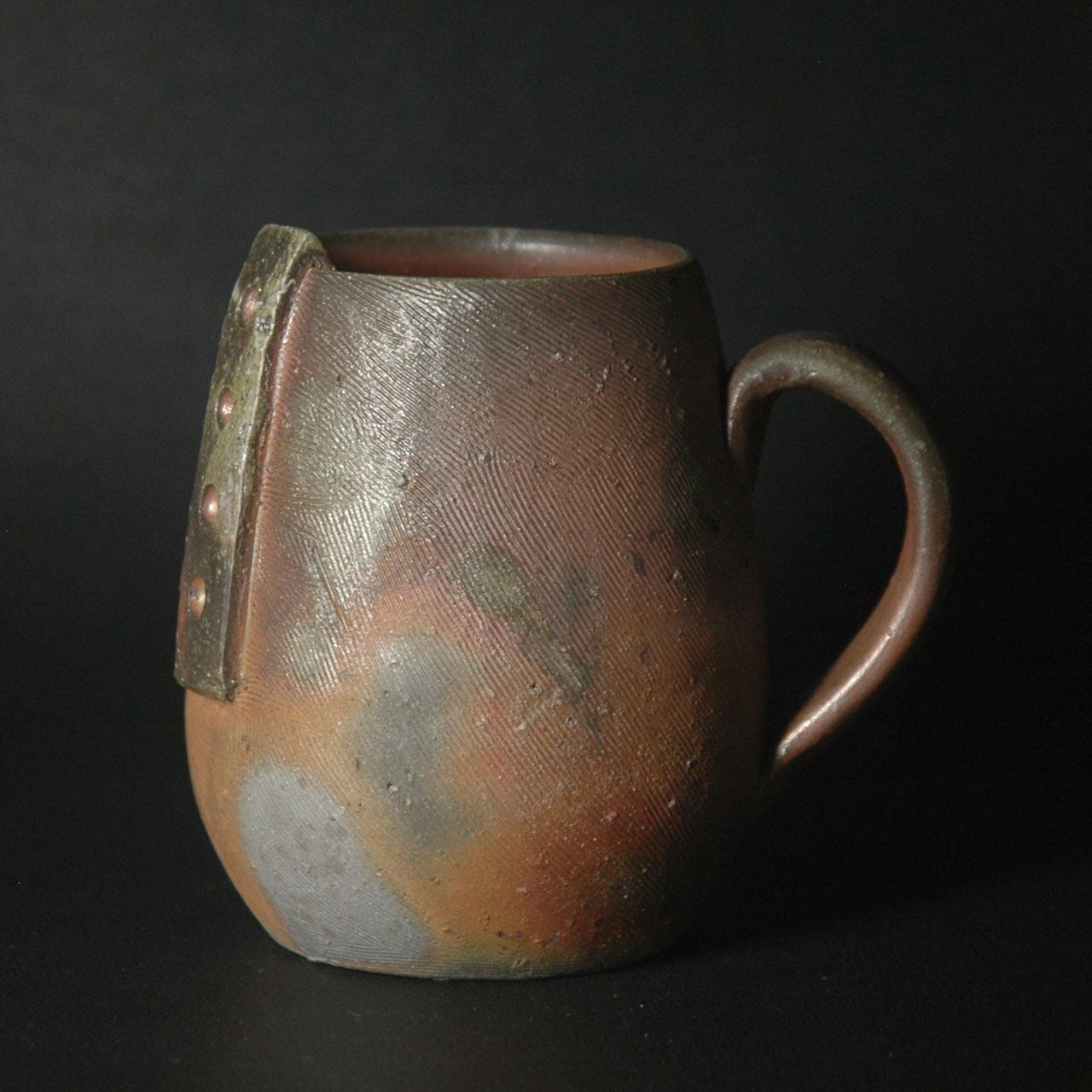 ロクロ成形後に表面を箆でならし、混錬せず原土の雰囲気を持たせた粘土でレリーフを作り、貼り付け、角窯(薪窯)で焼成。焼成最終段階で作品の間に木炭を投入。炭サンギリと呼ばれる技法で仕上げられた作品。