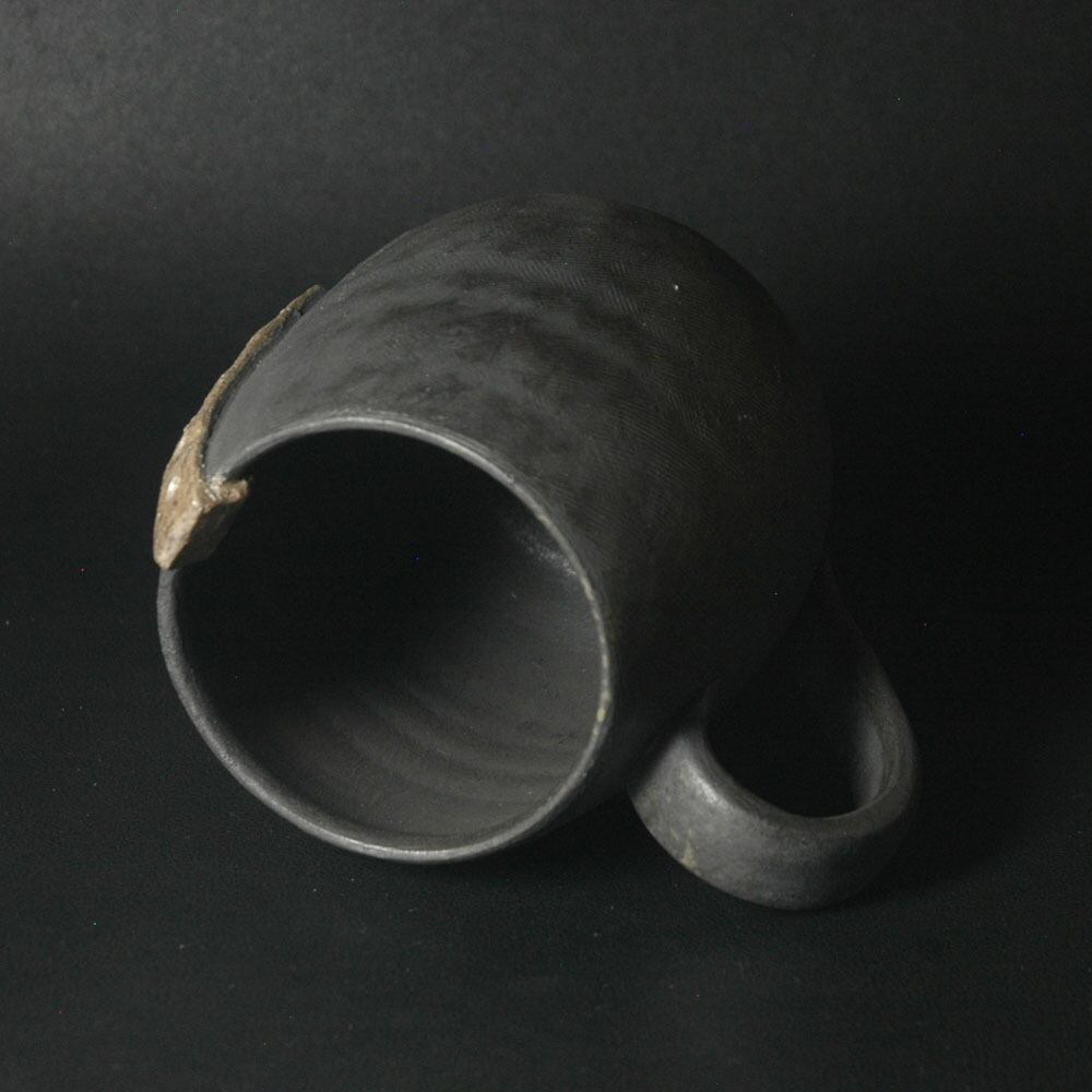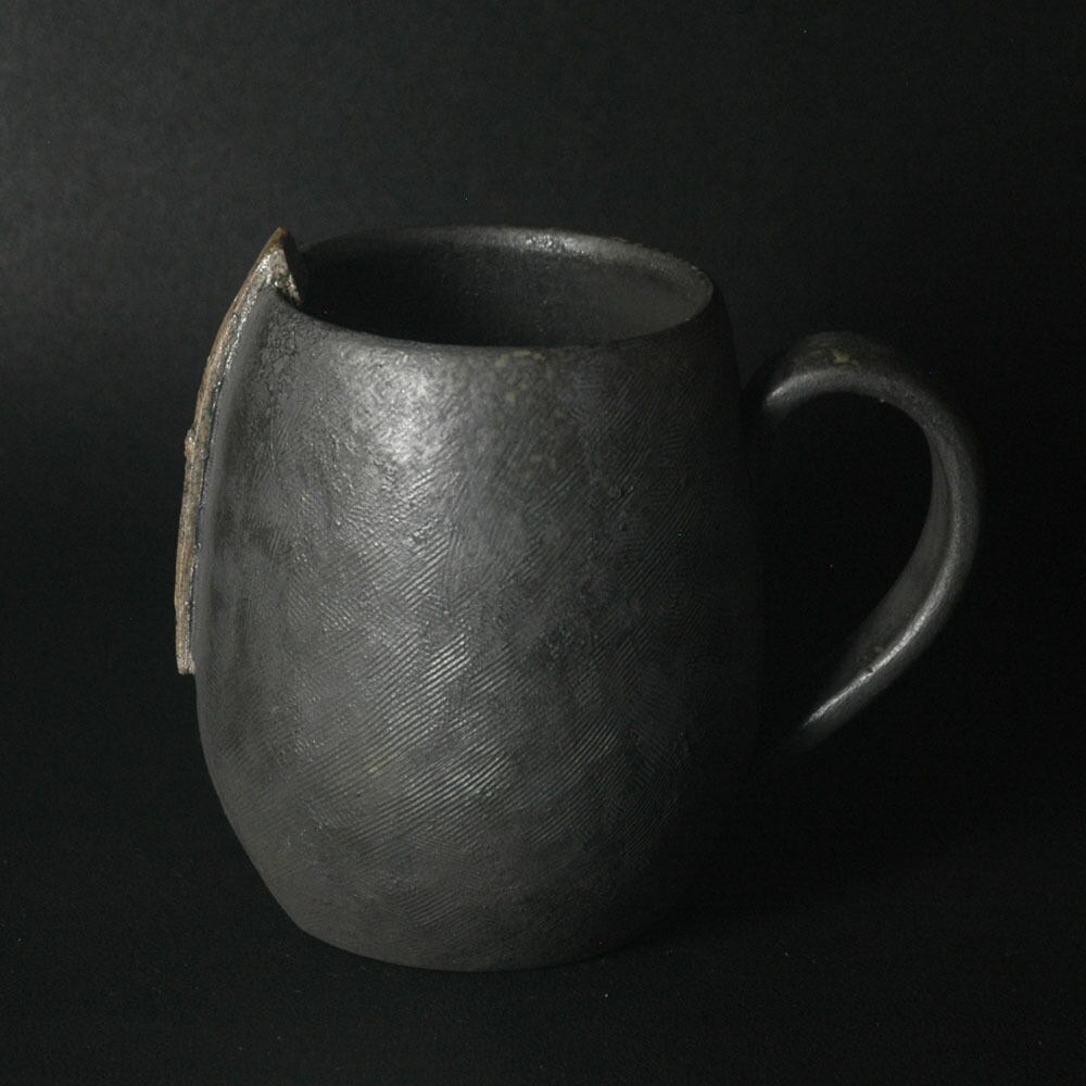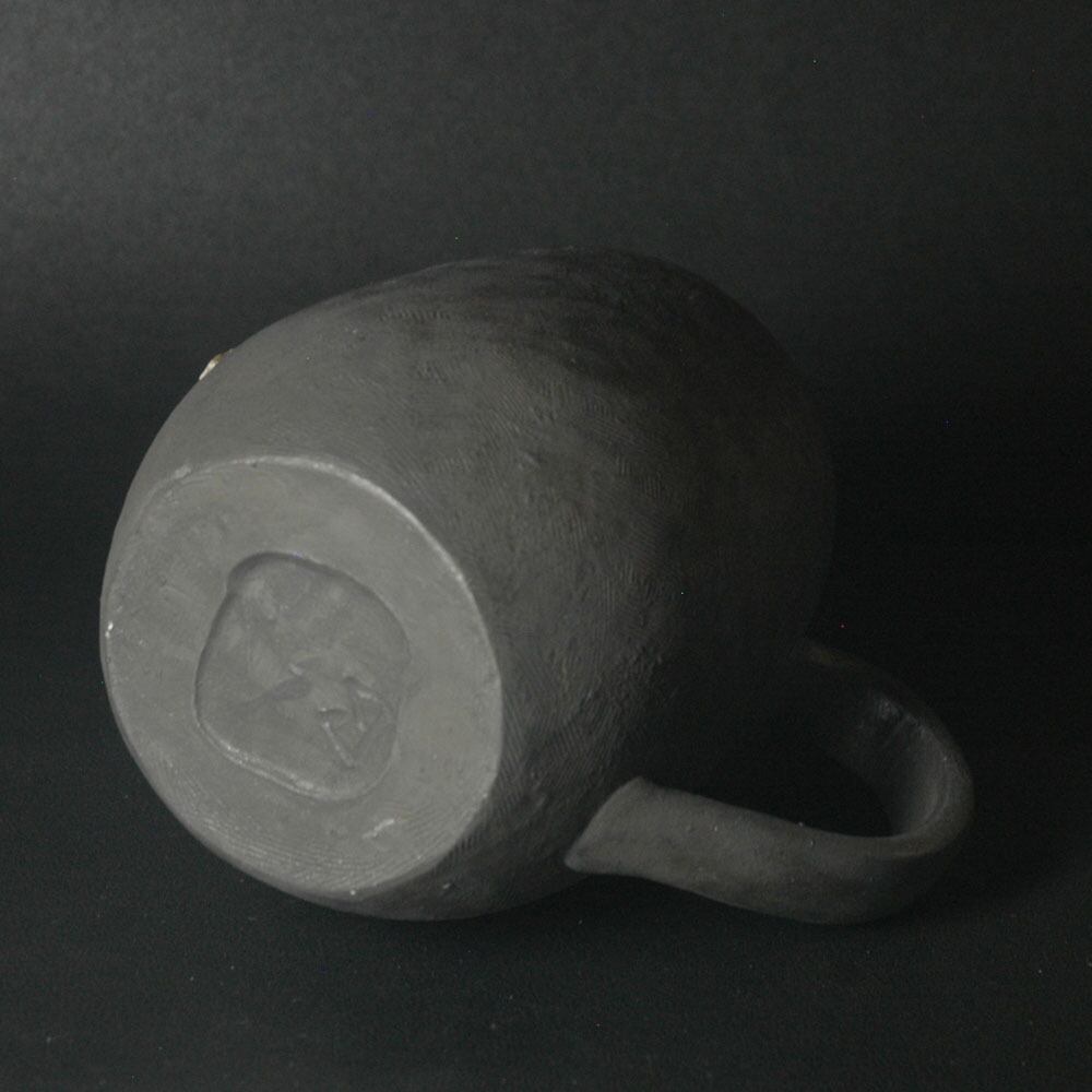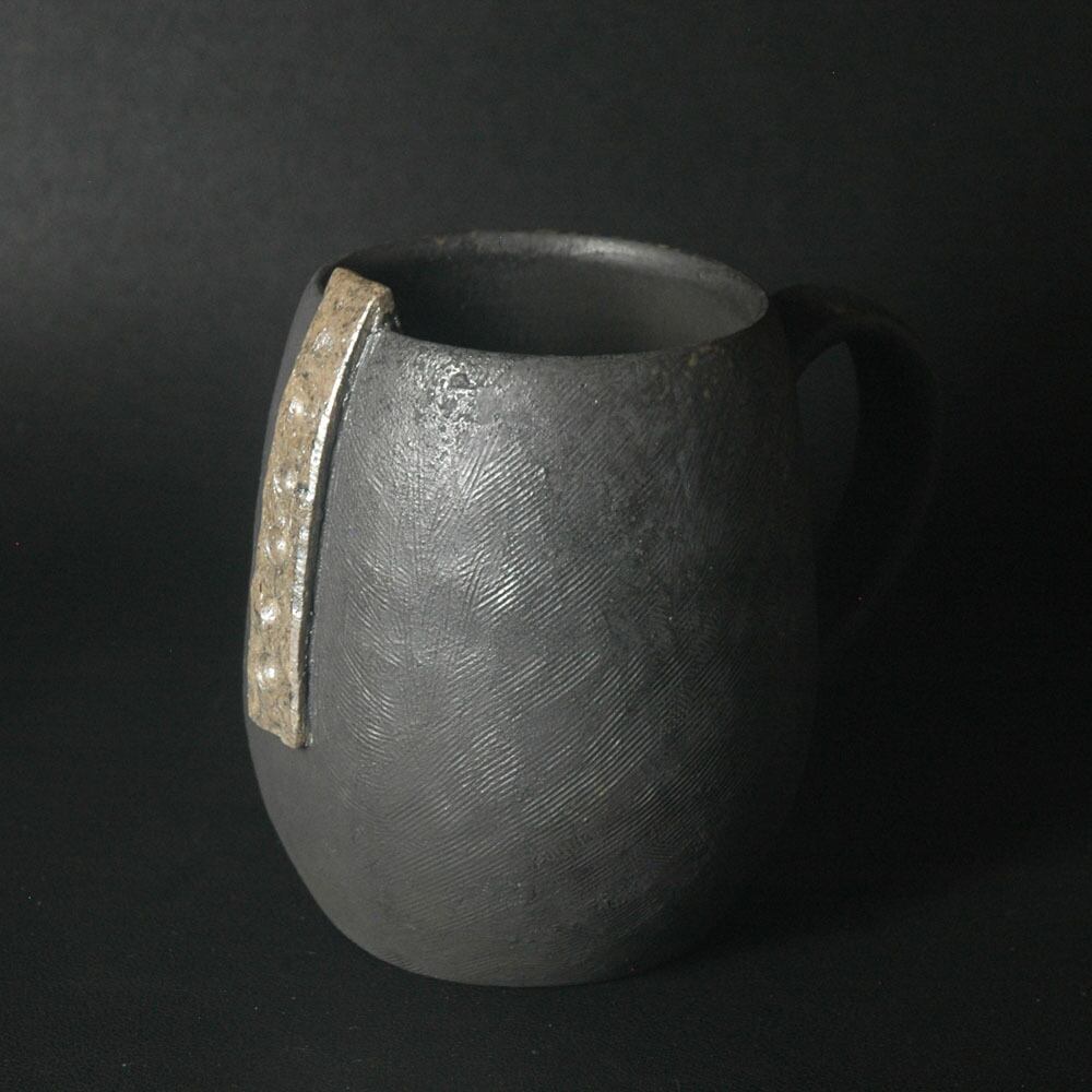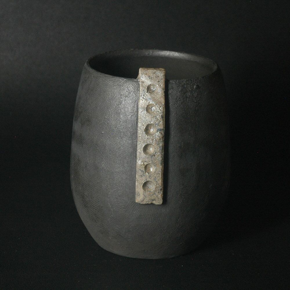 ロクロ成形後に表面を箆でならし、混錬せず原土の雰囲気を持たせた粘土でレリーフを作り、貼り付け、ガス窯で冷却還元焼成。