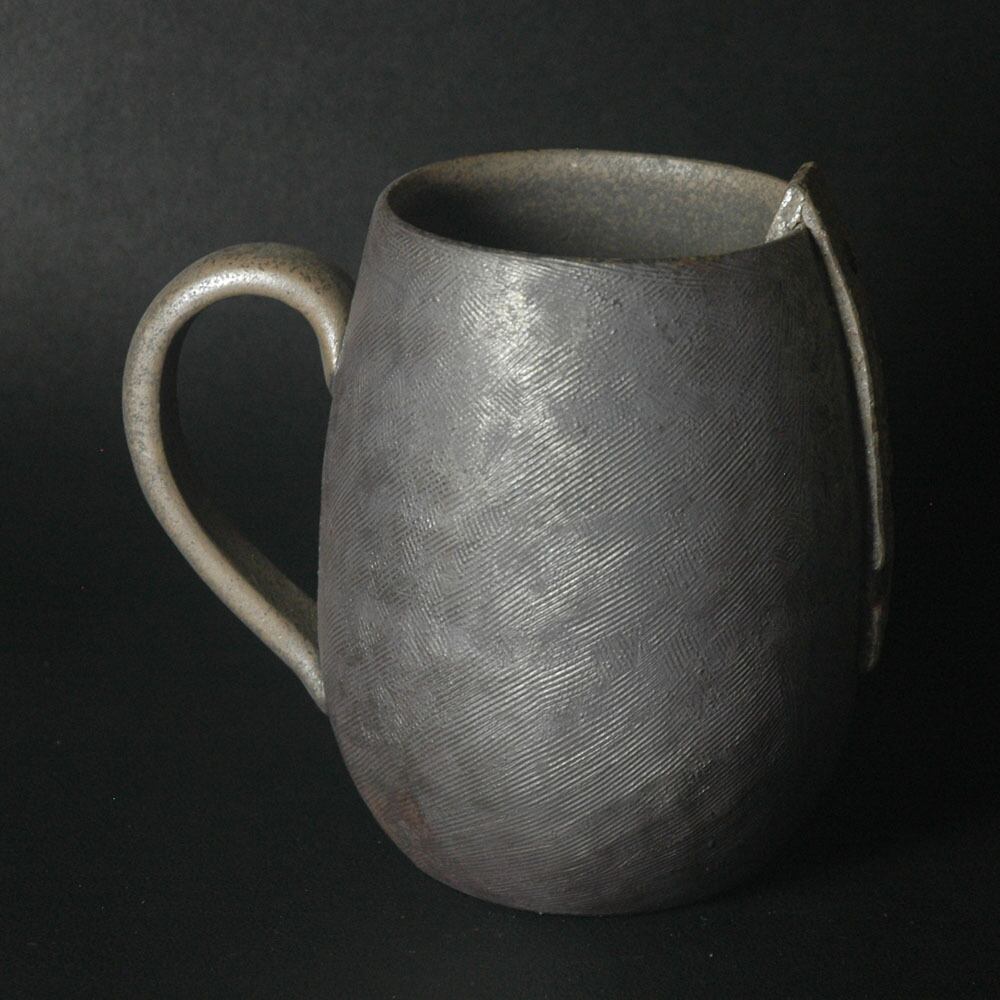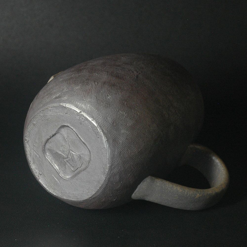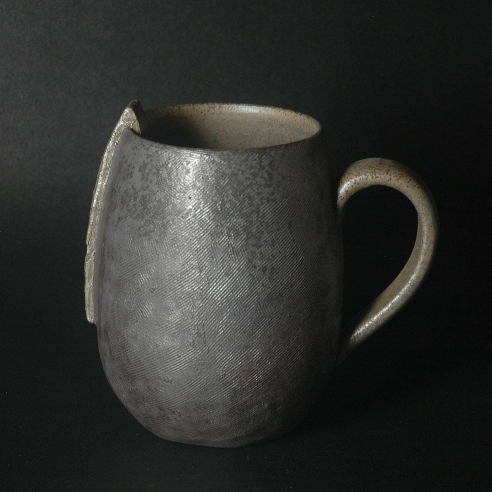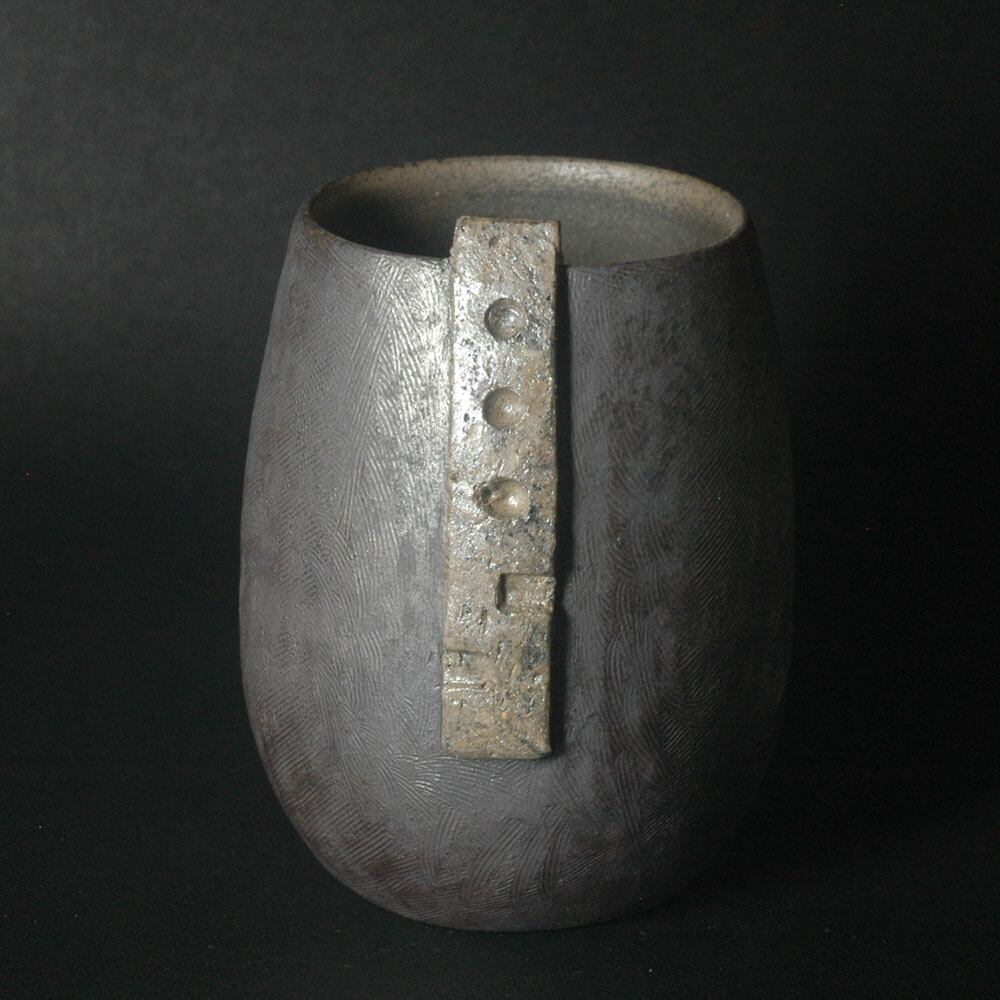 ロクロ成形後に表面を箆でならし、混錬せず原土の雰囲気を持たせた粘土でレリーフを作り、貼り付け、ガス窯で冷却還元焼成。